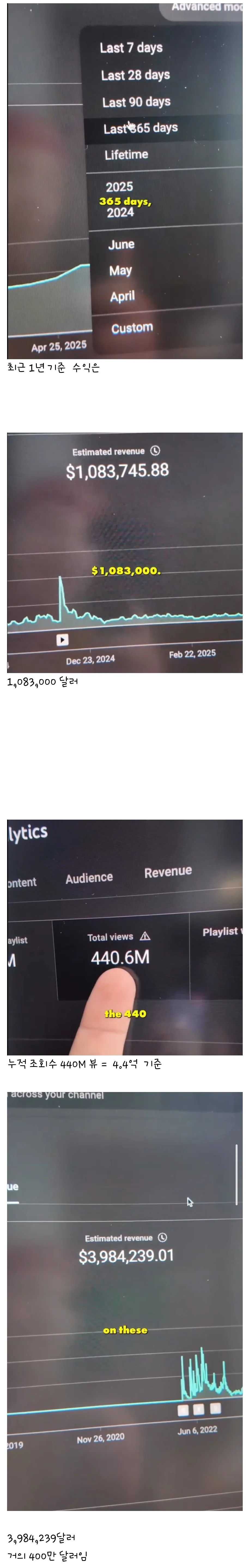 외국의 Unspeakable 라는 유튜버(오늘 기준 구독자 1940만명임)가 누적 440M 뷰 채널의 수익을 공개 했음