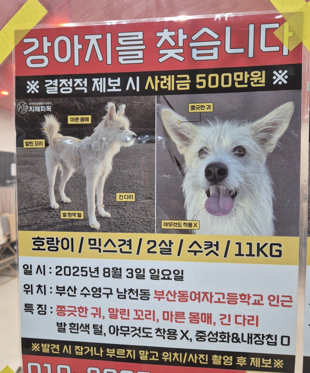 성수역 지나가다가 본 전단지인데 부산에서 잃어버린 댕댕이를 서울까지 부착함