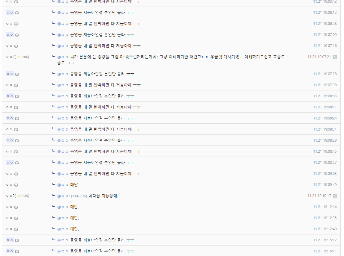 다른 사람이 "웅앵웅 내 말 반박하면 다 저능아야 ㅜㅜ"로 다시 글쓴이에 댓글에 응수를 했고