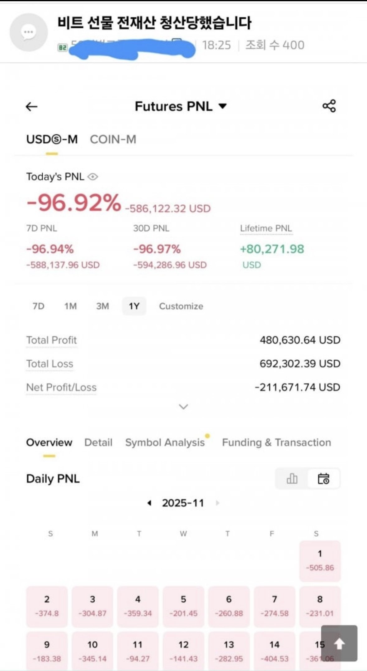 최근 코인 선물에서 청산 당하고 순자산 마이너스 전환