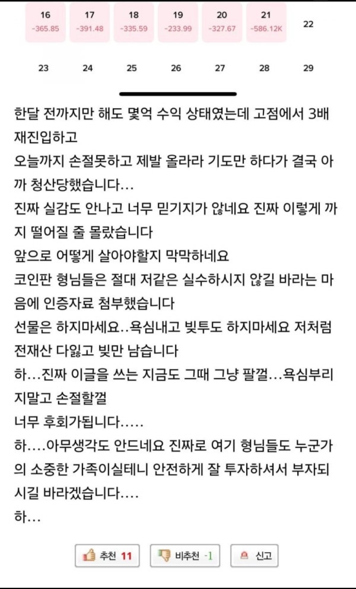 비트코인 10억 청산당한 사람이 올린 글