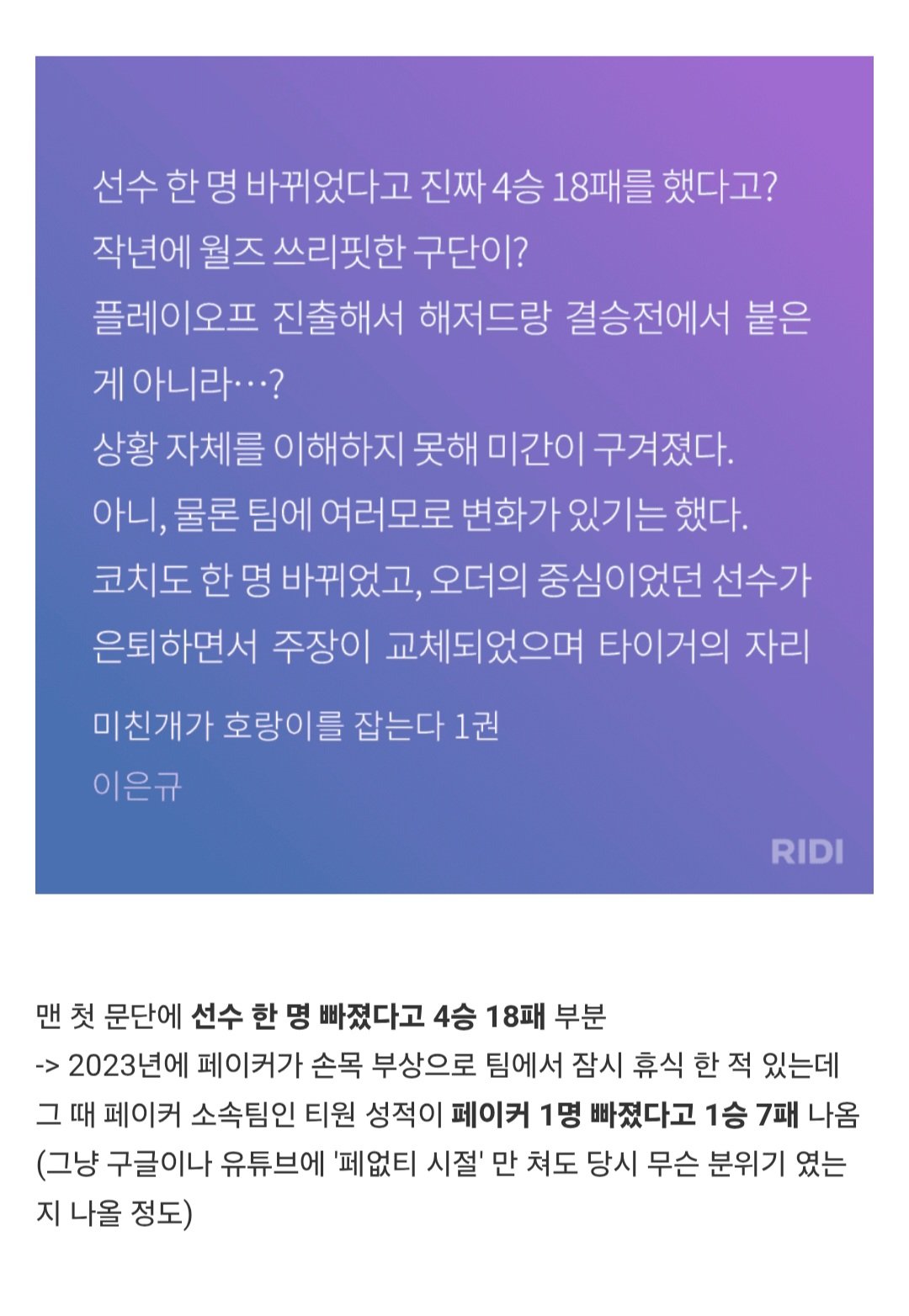 + 주인공이 11년 프로했다는데 그럼 데뷔하자마자 리핏우승 - 6년공백 - 쓰리핏우승임. 주인공이 대단한 선수라는걸 엄청 공들여 이야기하는 와중에 데뷔시즌부터 월즈우승이라는 서술은 없음 근데 주인공팀 타선수 관련 서술에서는 데뷔시즌 리그 우승 로열로드 언급함