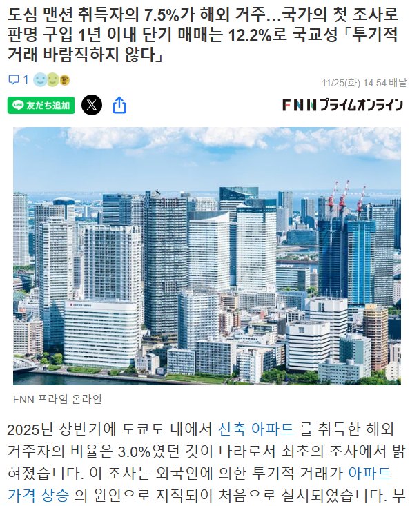 도쿄 도심 신축 아파트의 해외 거주자 비율이