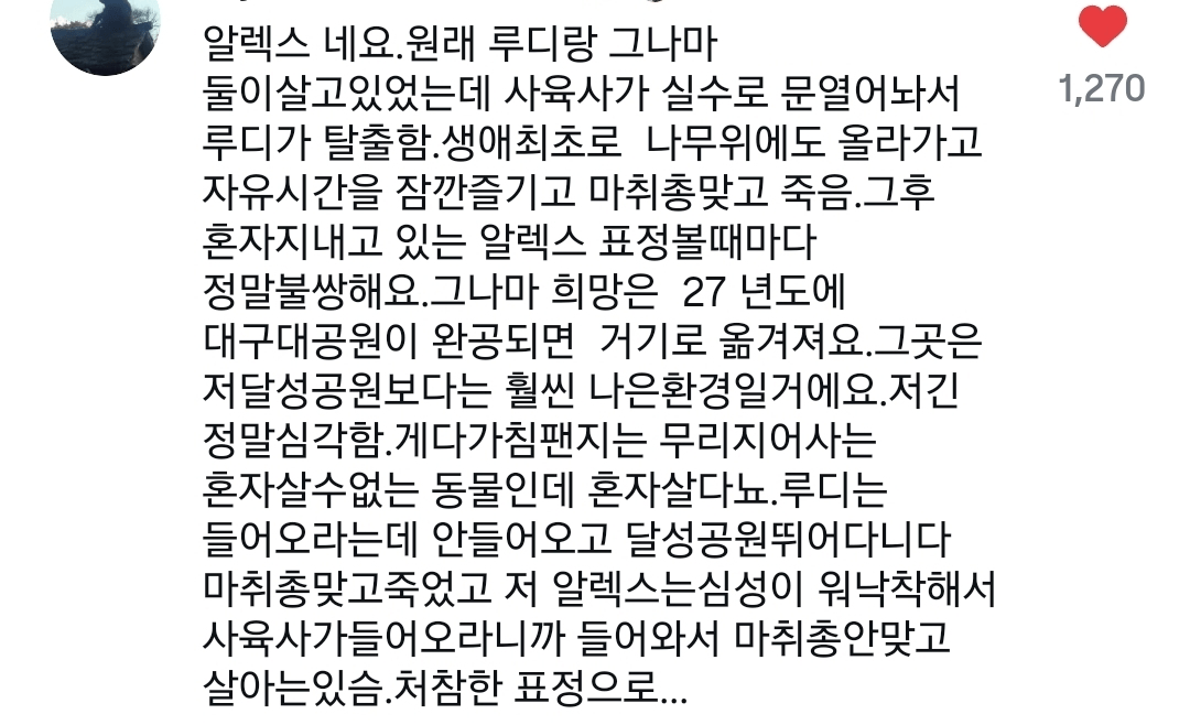 유튜브에 대구 달성공원 관련해서 찾아보니까 정형행동(이상행동) 자해 등 동물들의 상태가 상당히 이상하다고 함