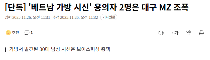 "베트남 가방 시신" 용의자 2명은 대구 MZ 조폭