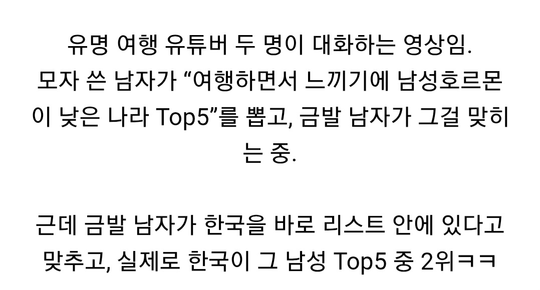 여행유튜버들 선정 남성호르몬이 낮게 느껴지는 나라