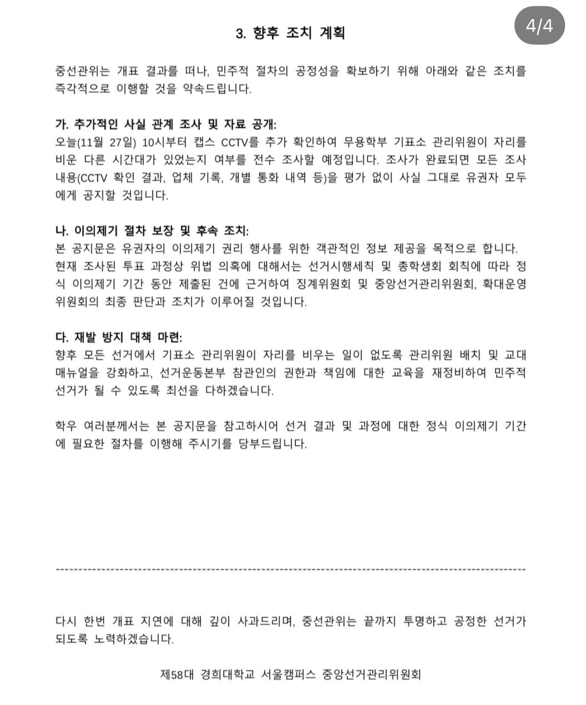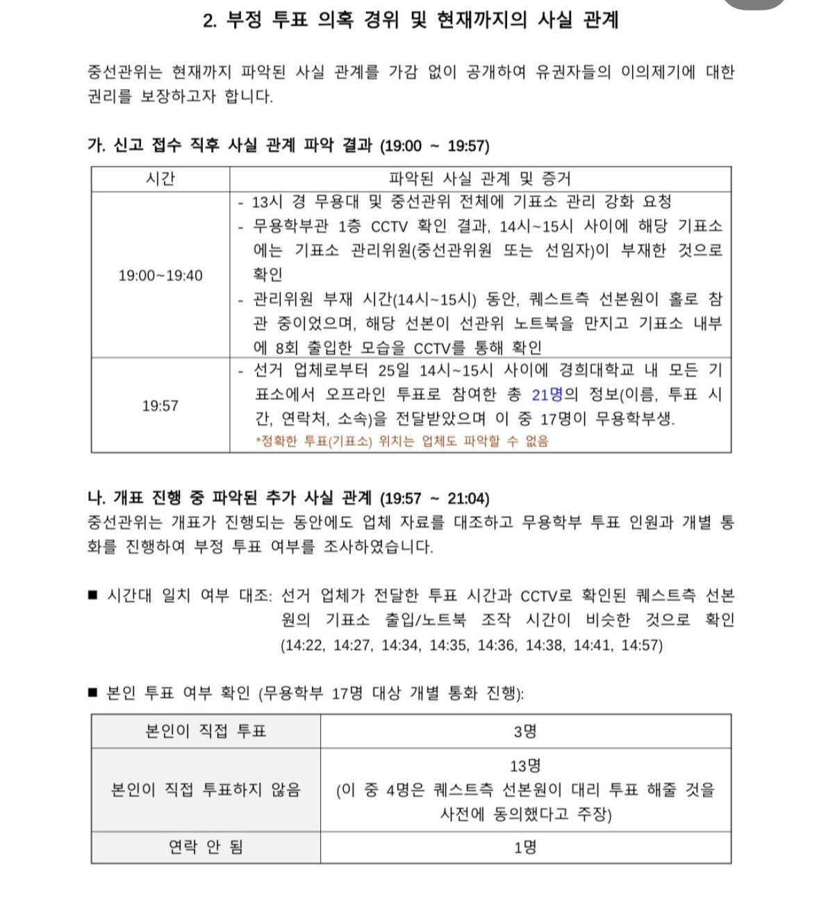 요약: 한 학생이 본인은 투표 한 적이 없는데 투표 기록이 남음 -> CCTV 확인해보니 당선인 측 선본원이 선관인이 자리를 비운 사이 대리투표(13표) 확인됨