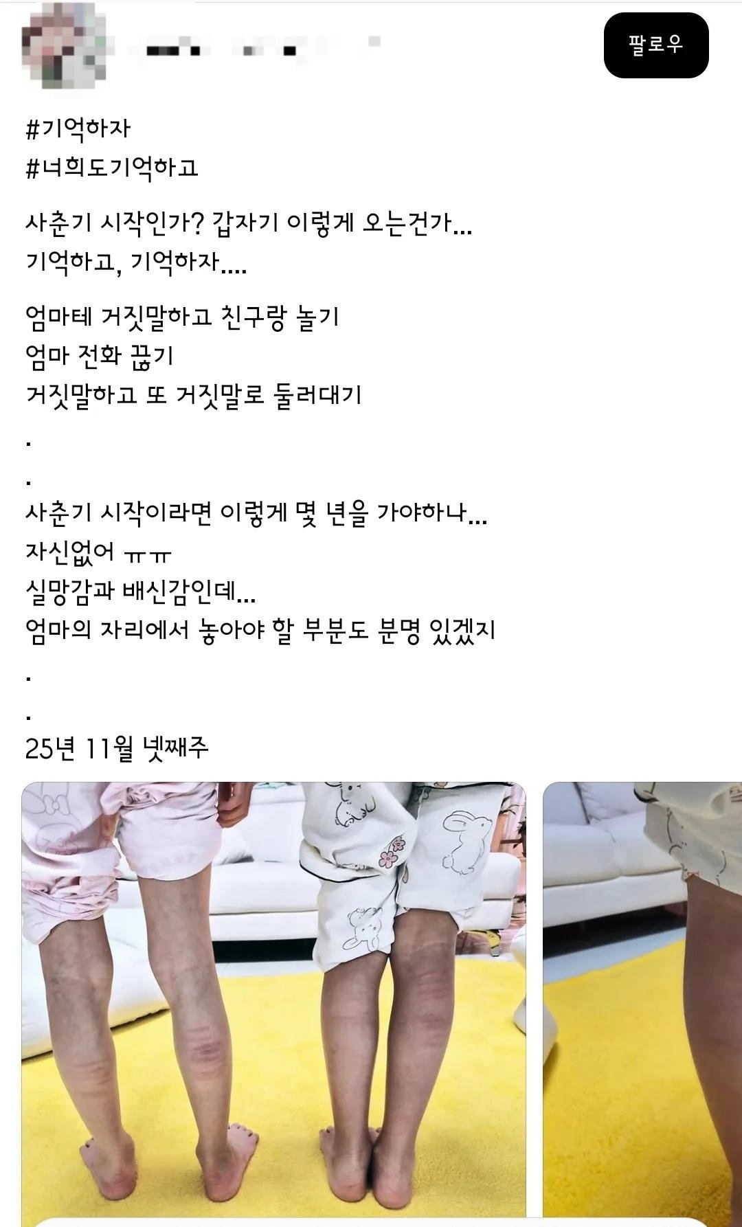 애들 다리에 줄이 쫙쫙 갈 정도로 때린