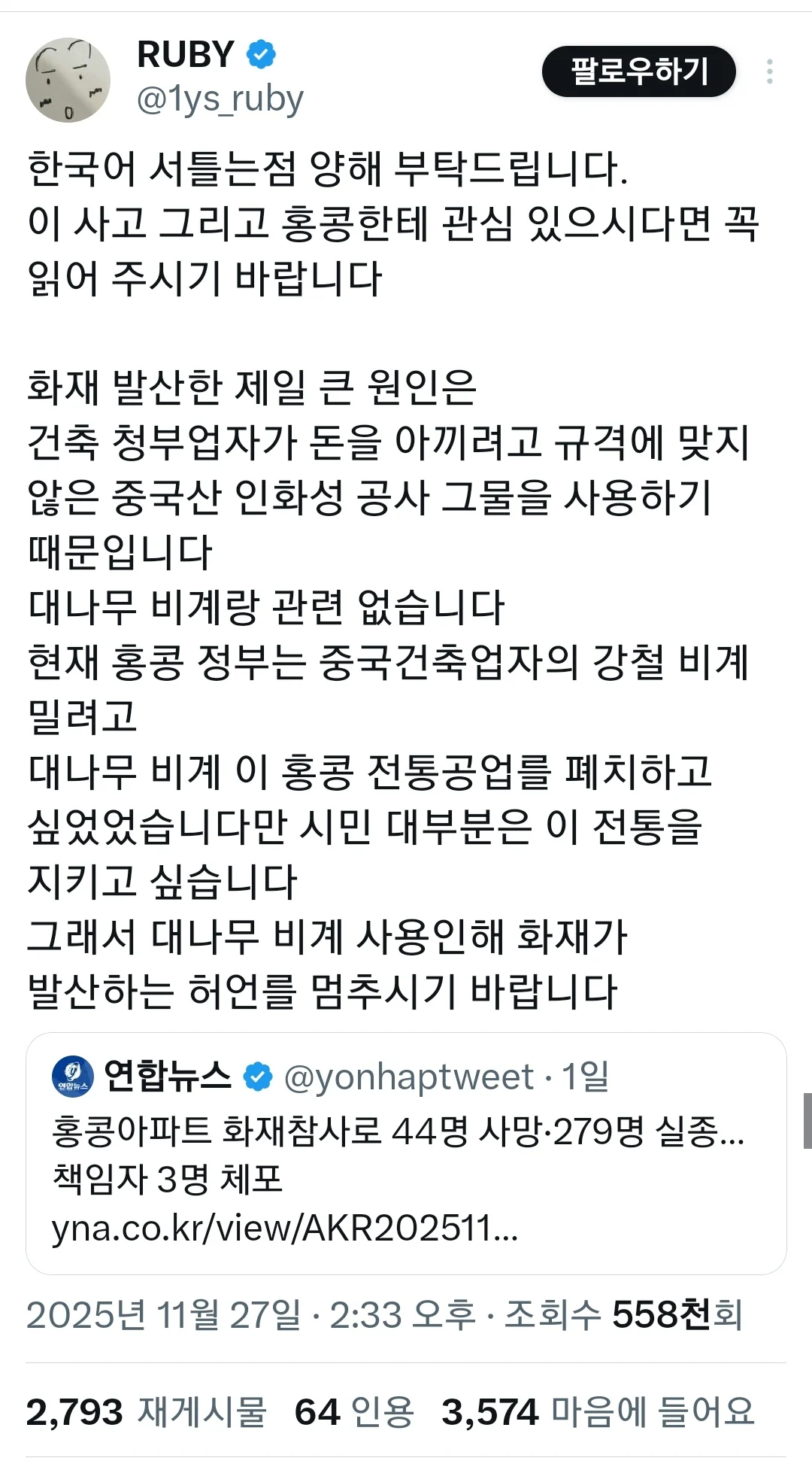 홍콩아파트 화재의 원인으로 지목당한 대나무는 억울했다 댓글 0 조회 532 2025-11-29 11:57 가지마라 Lv.3 게시글 보기 총 게시글: 886개 총 댓글: 0개 가지마라님의 다른 글 25.11.29 매년 이맘때 미국 소방서가 올리는 영상 25.11.29 잔치국수 예쁘게 담기 25.11.29 예전에 포토샵 학원에서 배운게 현타오네 25.11.29 현재 두바이 초콜렛 진화 상태