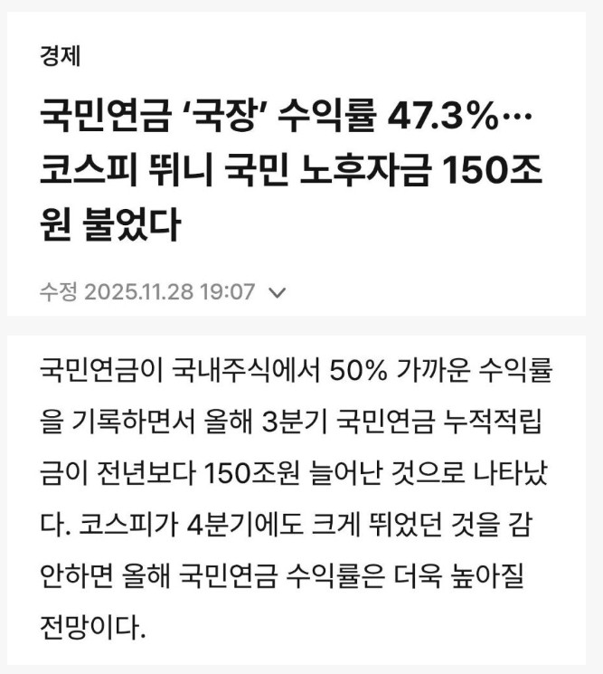 올해 주식시장 급등으로 국민연금 150조 증가!