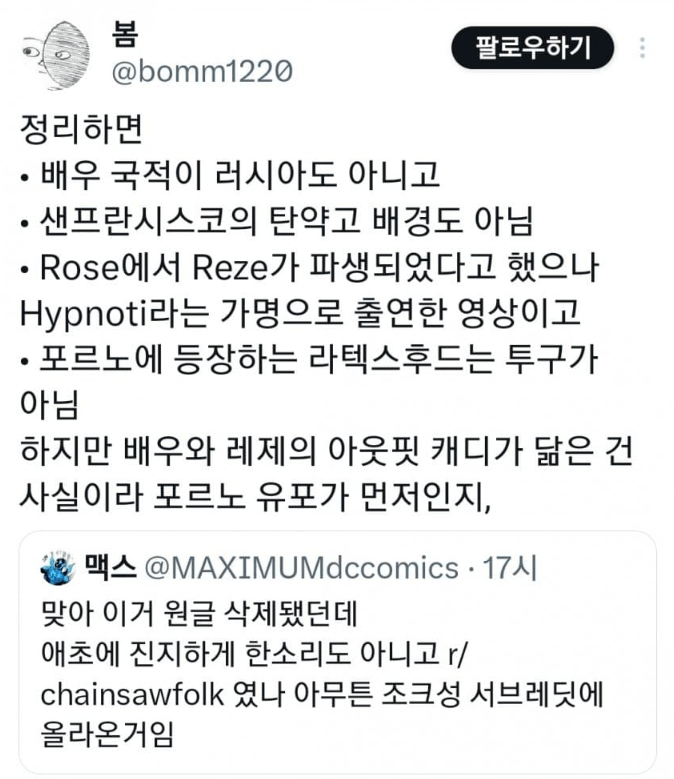 이후 여자 덕후들 사이에서 '레제의 모티브가 포르노 여배우다', '배우의 국적도 러시아라더라'