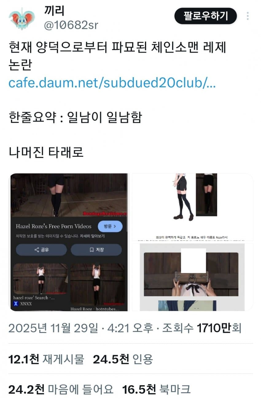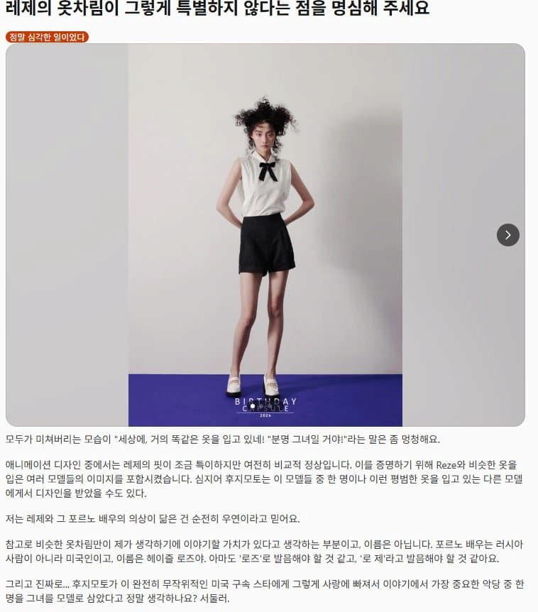 레딧에 체인소맨 '레제'의 착장 모티브가 성인 배우 Roze가 출연한 작품 내의 착장과 같다는 레딧발 떡밥이 나왔음