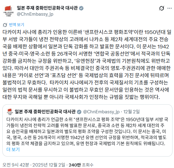 최근 다카이치 총리가 샌프란시스코 조약을 언급했는데..
