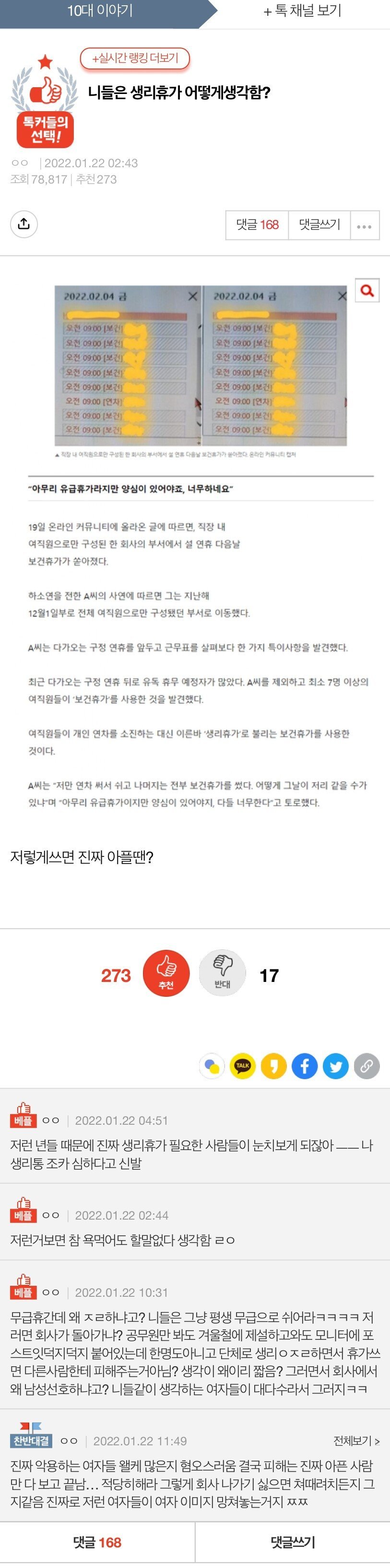 생리 휴가를 단체로 쓴 걸 본 판녀들 반응
