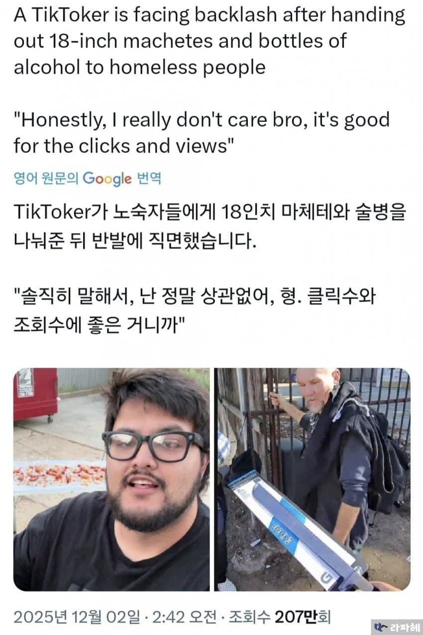 어느 틱톡커가 노숙자들에게 공짜로 나눠준 물건 ㄷㄷ