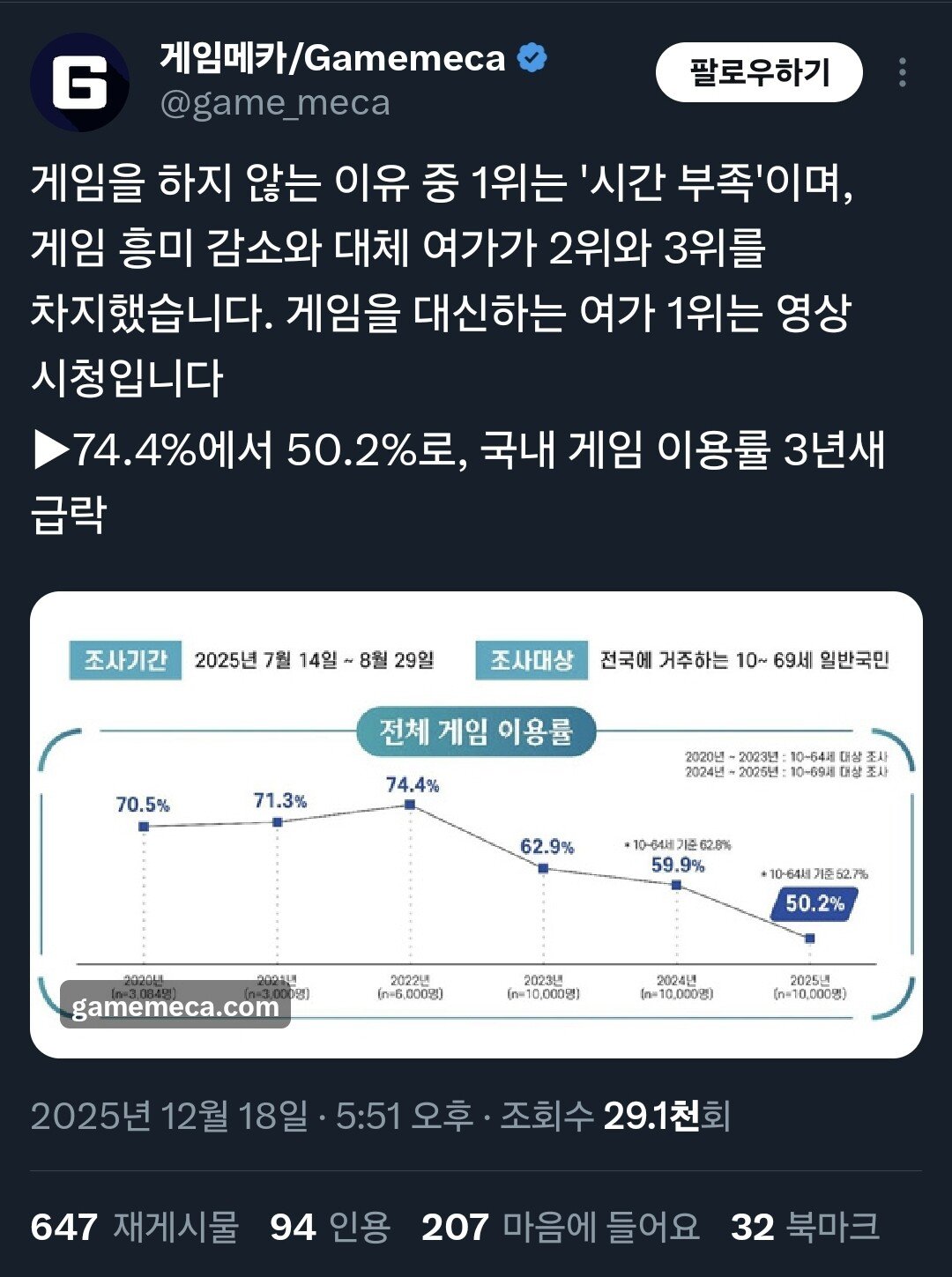 요즘 게임 이용률도 떡락중이라고 함