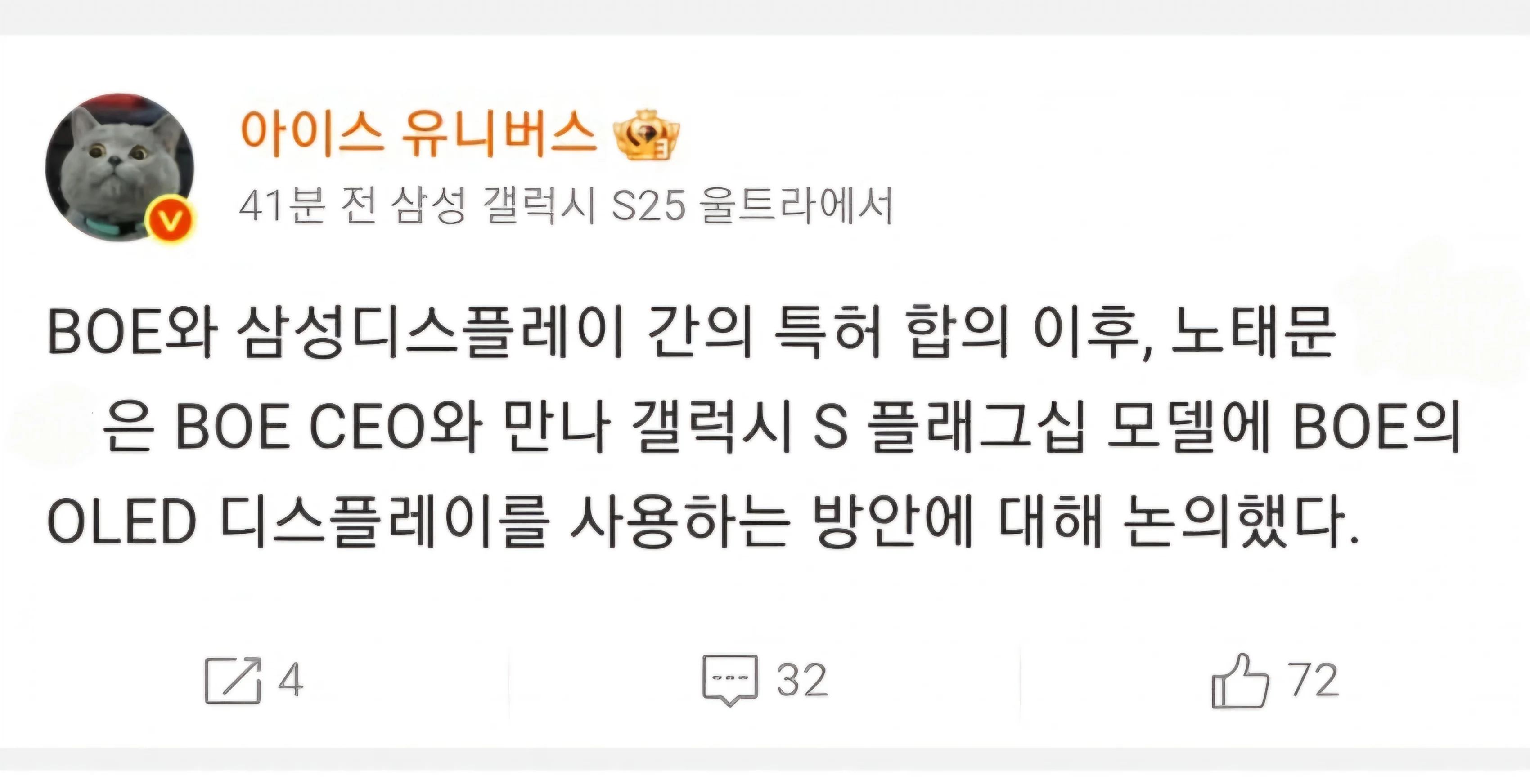 삼성 무선사업부 입장에선 필사적으로 원가절감 해야하기 때문에 이제 디스플레이도 BOE 써서 단가억제하려고 시도중
