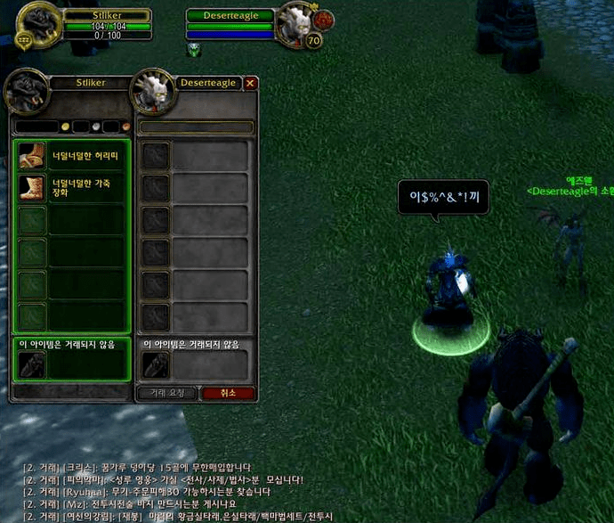 하지만 썬더 블러드 후프에서 거래창을 열자 들어온건 더러운 트럴남캐가 입는 너덜셋이었고 낚시에 충격을 받은 데좆은 이 병신새끼라고 욕을 했으나 필터링때문에 이 &*%#끼라고 욕을 하게 된다.