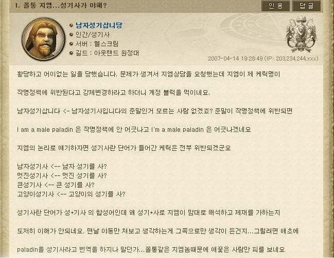 하지만 그는 블리자드 코리아의 탈압박에도 굴복하지않고 오히려 '성기사이즈킹'으로 캐릭터를 만드는 센스를 발휘했으나