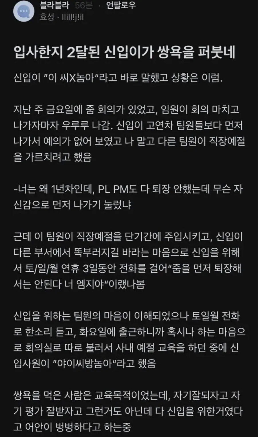 입사한지 2달된 신입이 쌍욕한 이유 ㄷㄷ