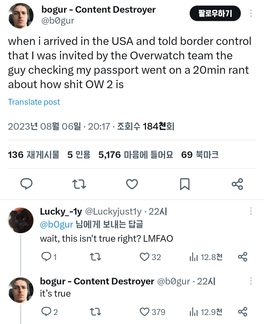 프로게이머: 내가 미국에 입국했을때 국경통제소에 오버워치2 프로게이머라고 하니깐 입국 심사원이 오버워치2가 얼마나 구린지에 대해 20여분간 폭언을 했음.