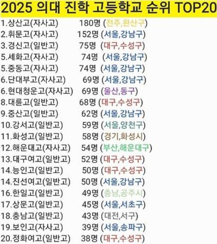 2025 의대 진학 고등학교 순위