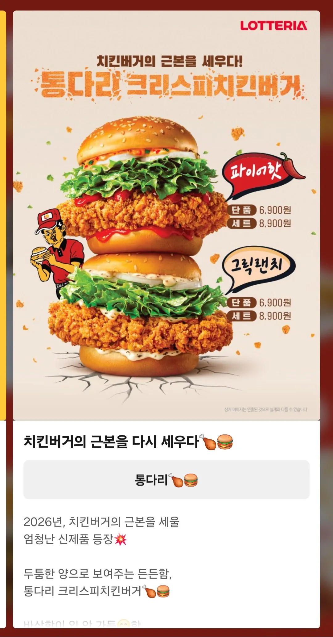 이번에 단품6900원 세트 8900원으로 닭다리살 버거 나옴