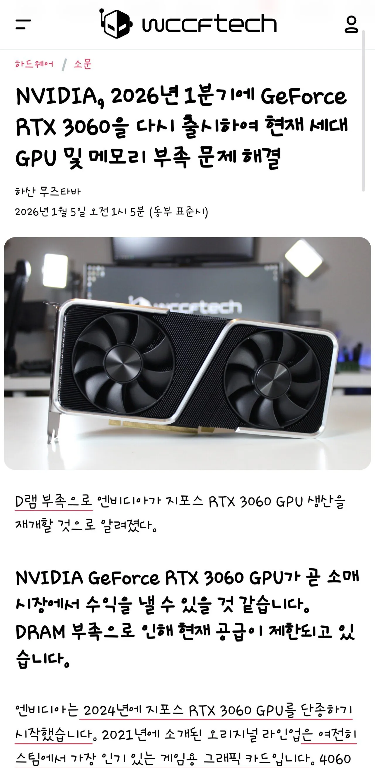 [루머] 엔비디아, RTX 3060 1분기 내 재 출시