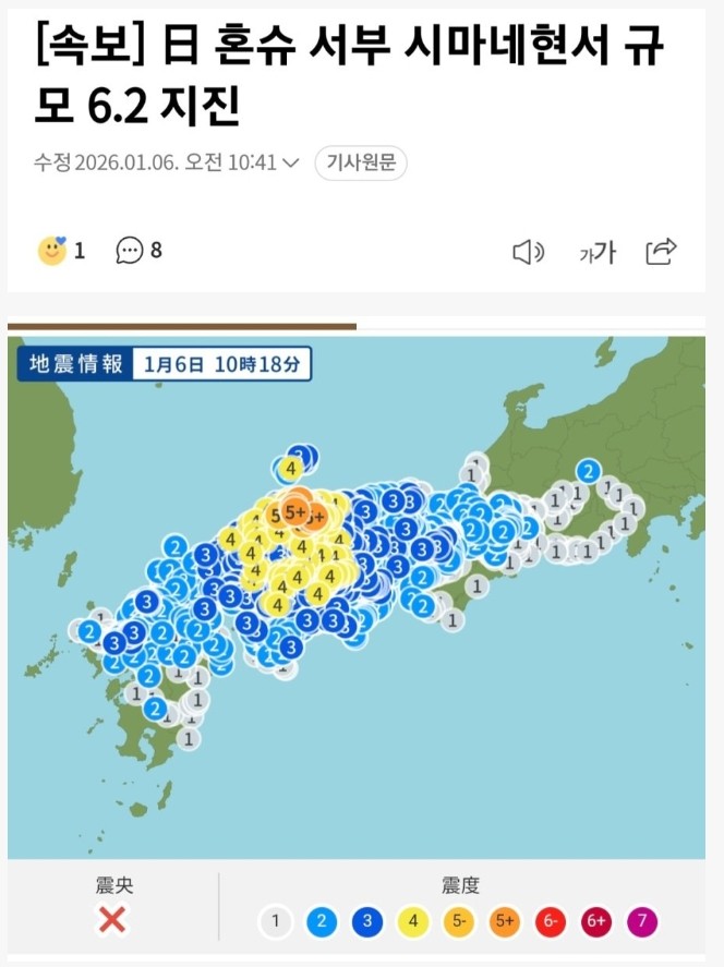 기상청에 따르면 지진은 6일 오전 10시 18분께 시마네현 동부 지역을 진앙으로 발생했으며, 진원의 깊이는 약 10㎞로 비교적 얕은 것으로 추정됐다. 이번 지진으로 시마네현 동부와 돗토리현 서부 일부 지역에서는 진도 5강의 흔들림이 관측됐다.
