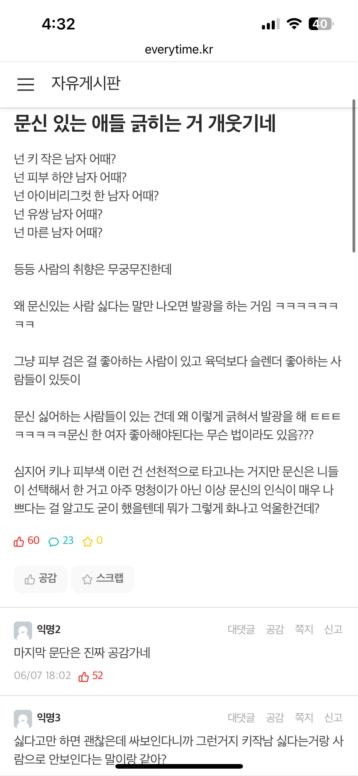 문신 있는 애들 긁히는 거 개웃기네