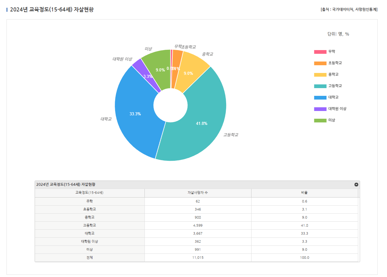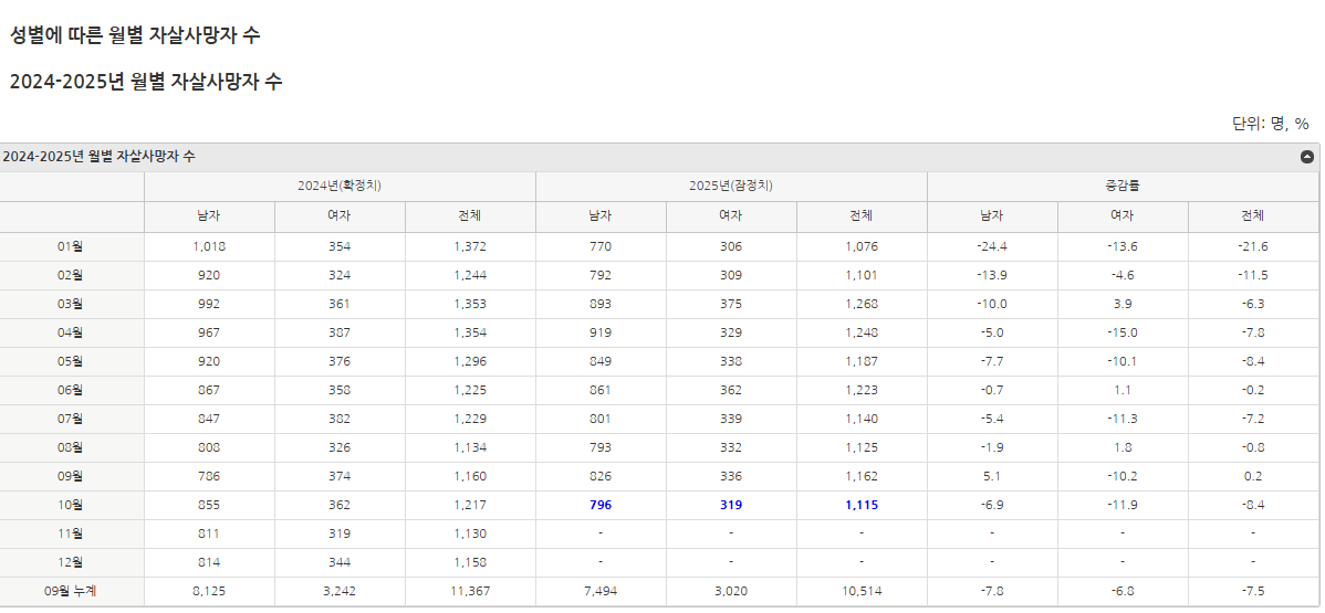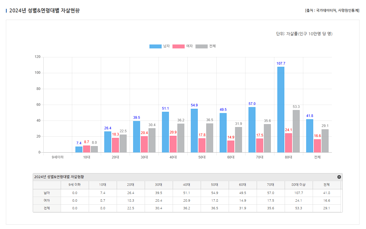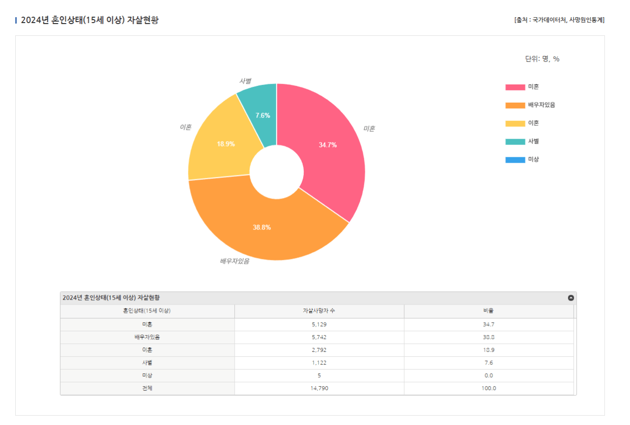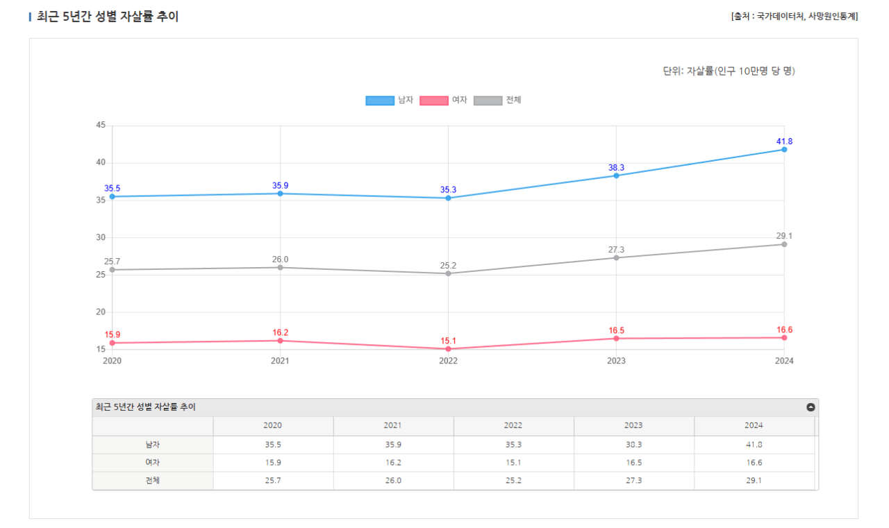 특히 남성의 자살률 증가폭이 매우 크고 세간의 생각과 다르게 미혼자보다 기혼자 자살률이 더 높게 집계되었음