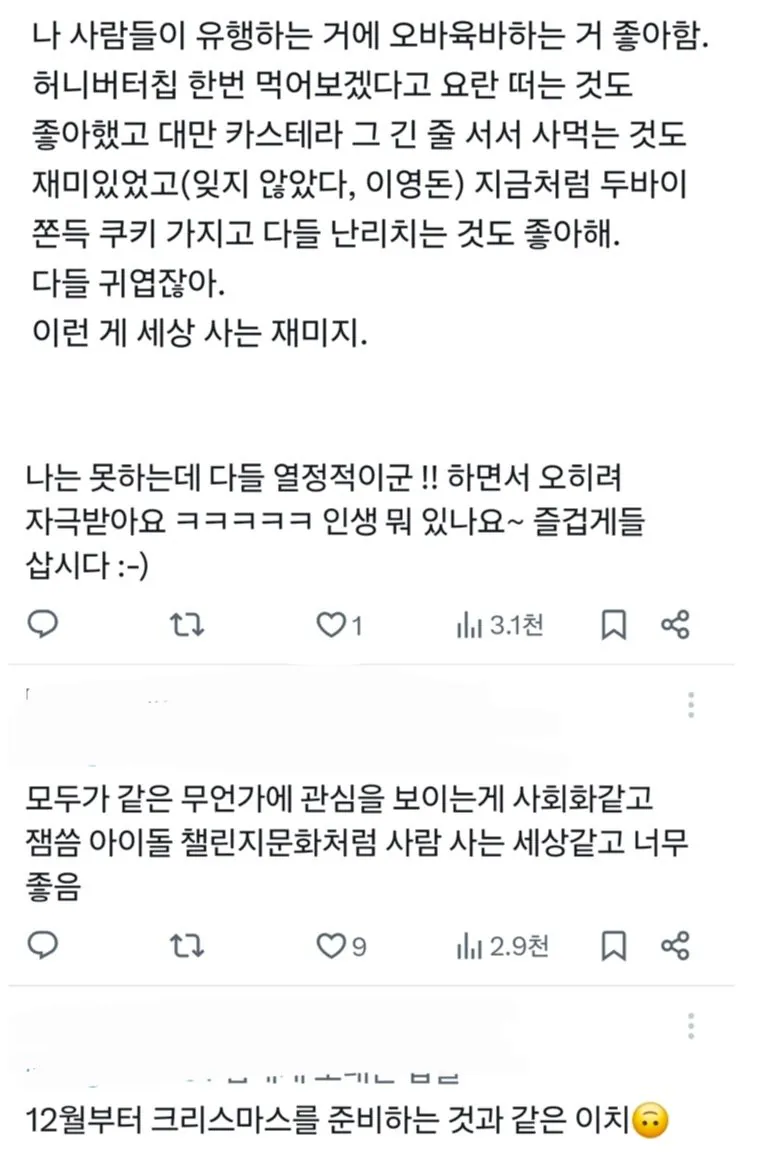 나 사람들이 유행하는 거에 오바육바하는 거 좋아함