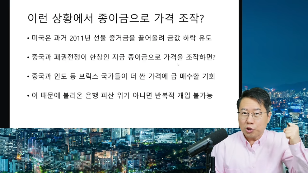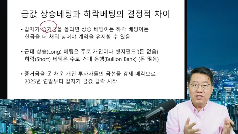 금값의 상승베팅은 돈이 적은 개인과 헤지펀드, 하락베팅은 돈이 많은 거대은행이 주로 하기에 증거금 기준을 갑자기 올리면 하락베팅에 유리하다