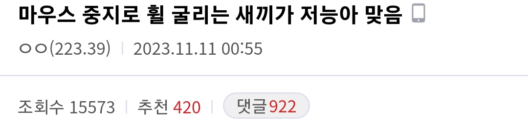 마우스 중지로 휠 굴리는 사람은 저능아라는 디씨인 댓글 2 조회 545 2026-01-13 07:59 관셈보살 Lv.3 게시글 보기 총 게시글: 1,380개 총 댓글: 0개 생각해본적은 없는데 당연히 검지 쓰나? 관셈보살님의 다른 글 26.01.13 일론 머스크가 말하는 남한과 북한의 차이 26.01.13 현대사회를 지탱하는 신의물질 +1 26.01.13 일론머스크 380조 자산 체감 +2 26.01.13 마우스 중지로 휠 굴리는 사람은 저능아라는 디씨인