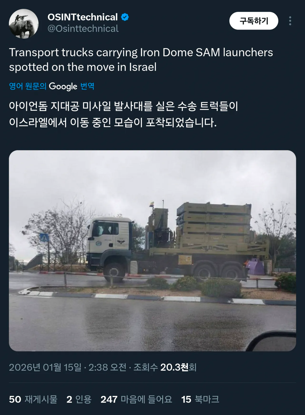 이스라엘 아이언돔 미사일 이동 중