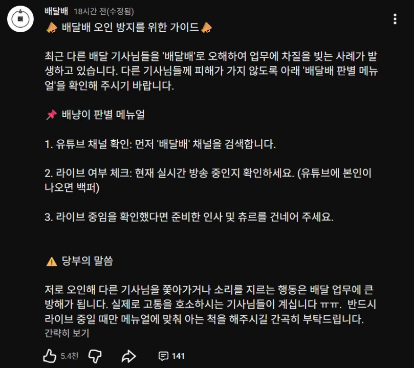배달 유튜버가 간곡히 호소한 이유