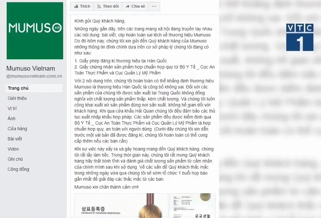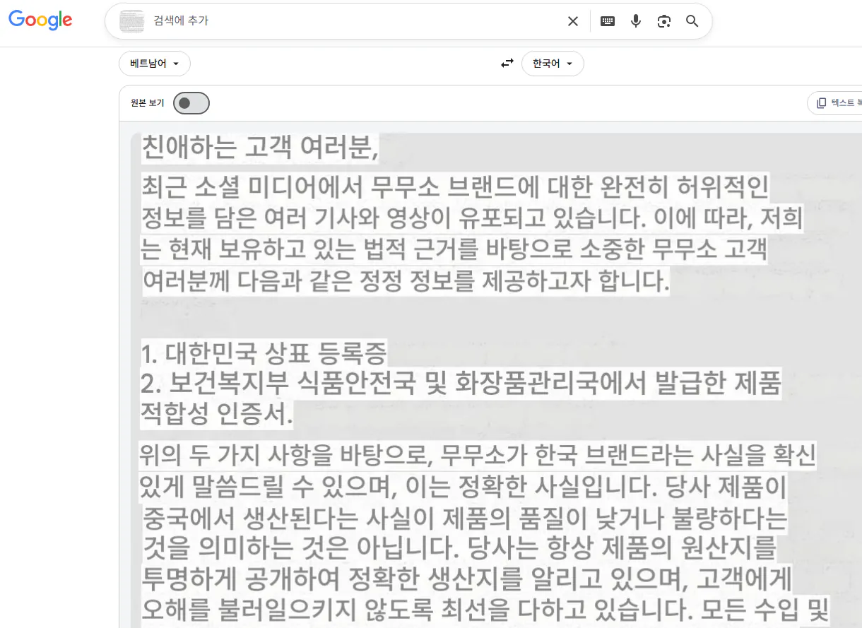 무무소 베트남은 무무소가 한국에 상표를 등록한 한국 회사가 맞다고 음해하지 말라고 함