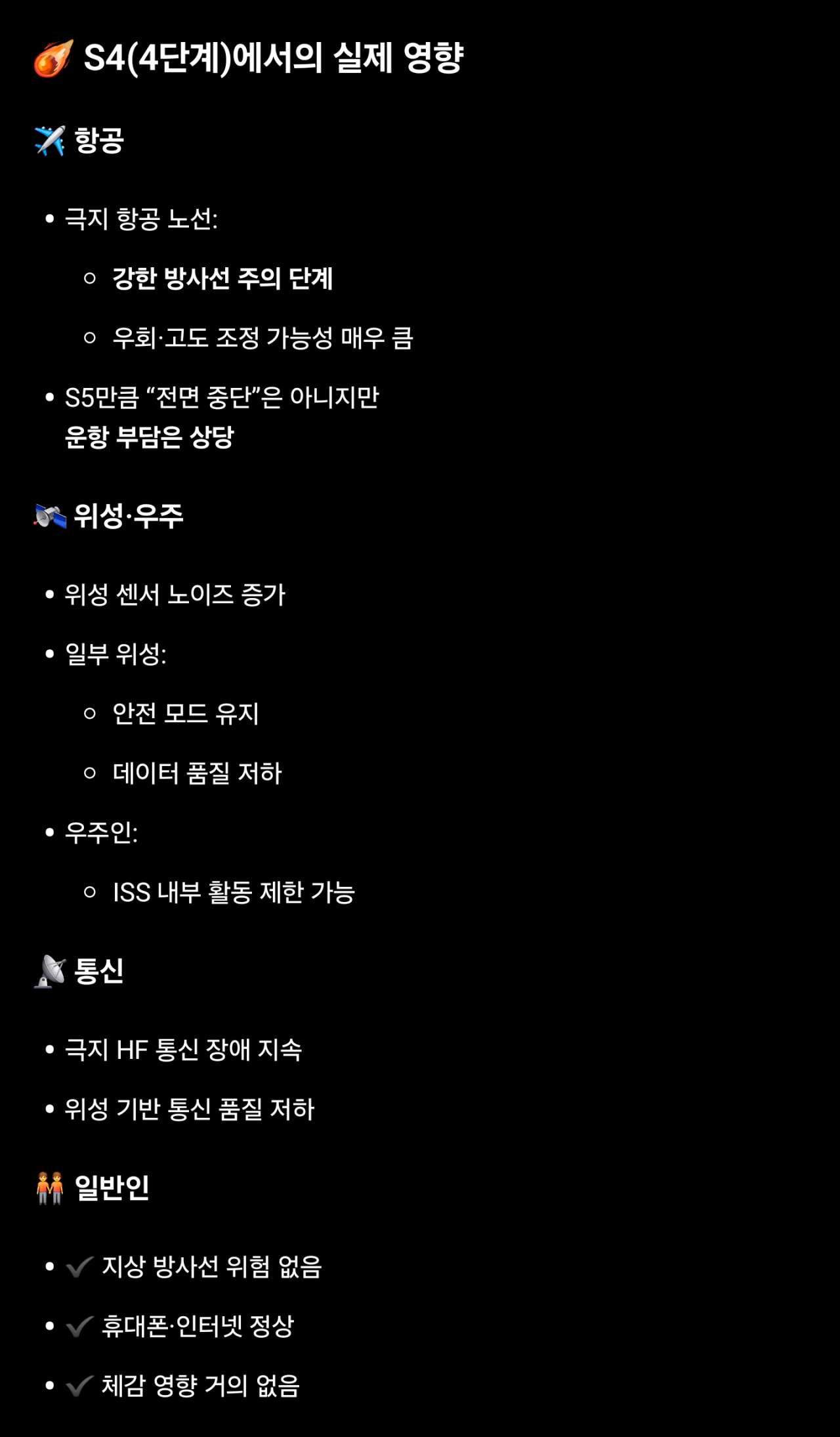 기타 : 극지방에서 HF 통신에 장애가 발생하며, 수일동안 위치추적에 에러가 증가할 수 있음.