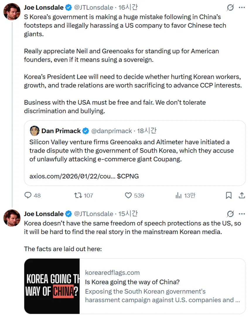 팔란티어 창업자, 쿠팡 사태에 "한국은 중국을 따라한다"