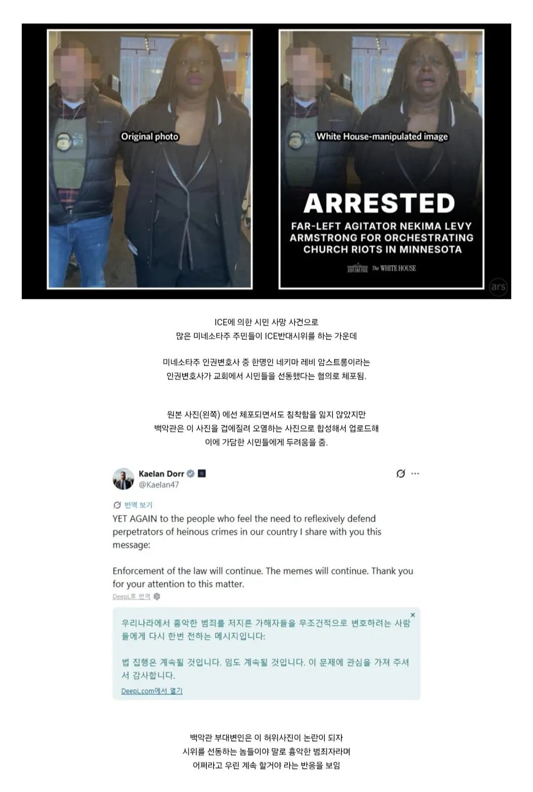 미국 ICE 반대시위 하다 체포된 변호사 사진 조작한 백악관