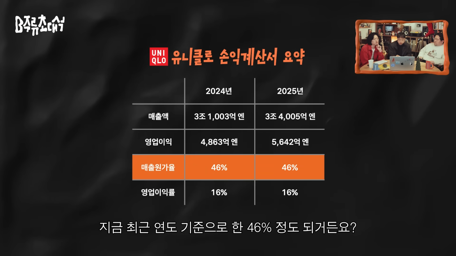 경영을 잘해서 이익률도 16퍼센트 계속 유지하는 유니클로