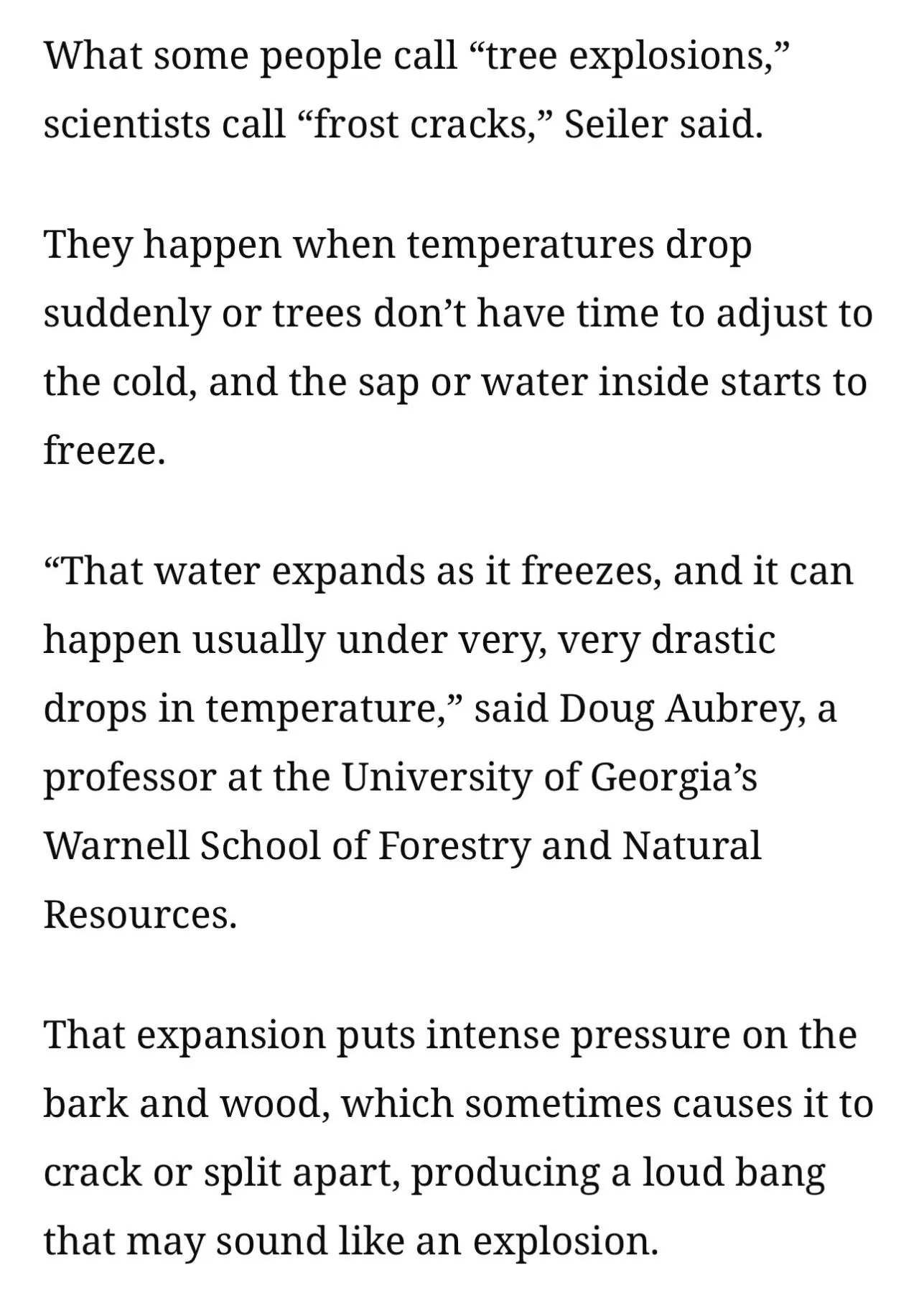 너무 추워서 나무가 폭발하는 미국 댓글 0 조회 512 2026-01-26 13:38 가지마라 Lv.3 게시글 보기 총 게시글: 1,462개 총 댓글: 0개 https://edition.cnn.com/2026/01/22/weather/exploding-trees-winter-storm 추가)) 날씨가 갑자기 엄청나게 추워져 나무 속 물이 얼면서 팽창하면 나무와 껍질에 압력이 증가하며 영상처럼 갑자기 폭발하듯 쪼개지게 됨 총소리나 작은 폭탄 터지는 소리로 들리기도 한다고 해당 현상 후 회복한 나무 추가)) 동네 가로수가 추워서 쪼개지는 소리에 깼다는 사람 가지마라님의 다른 글 26.01.26 남자는 어린게 최고라는 30살 여성 26.01.26 요즘 사람들은 의외로 잘 모르는 잣 본래 모습 26.01.26 한달동안 라면만 먹어야하면 뭘 사야할까? 26.01.26 배달앱이랑 매장이랑 가격 다르면 시켜먹는다 vs 안먹는다