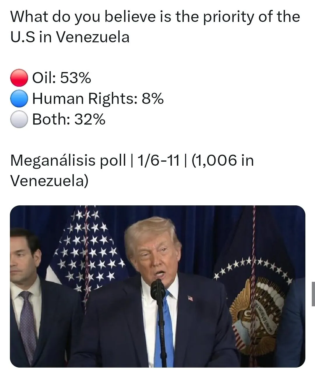그러나 베네수엘라인들의 절반이상은 미국의 주 목적이 석유라고 생각하고 있음.