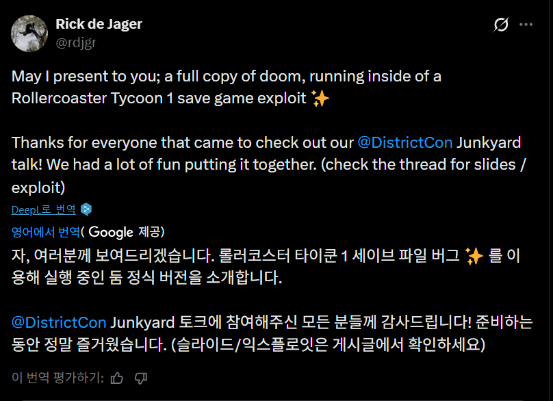 롤러코스터 타이쿤 1의 세이브파일로 둠을 돌리는데 성공했다고 함