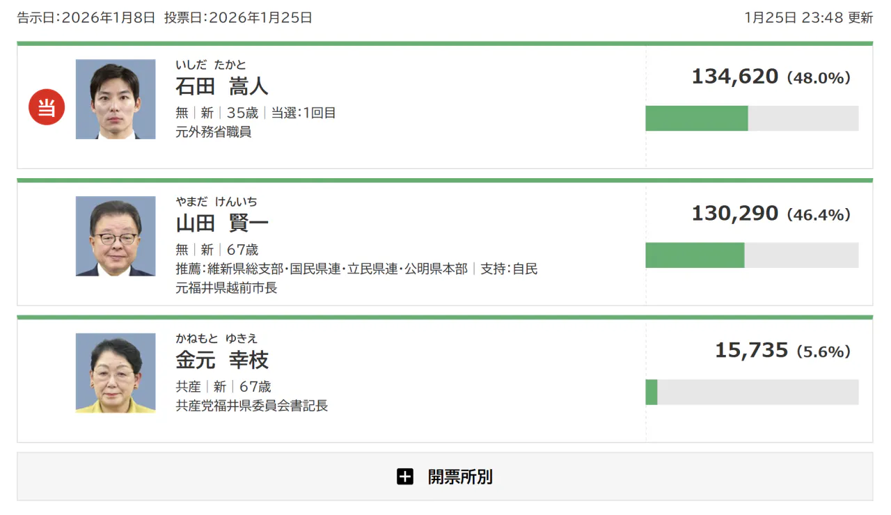 35세의 이시다 다카토 후보가 당선됨.