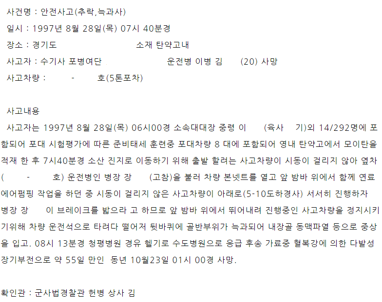 1. 해당 부대 포대장이 "사고 당시에 옆차 운전병인 장00병장과 죽은 김00이병 밖에 없어서 사고 원인을 아무도 모른다"고 함.