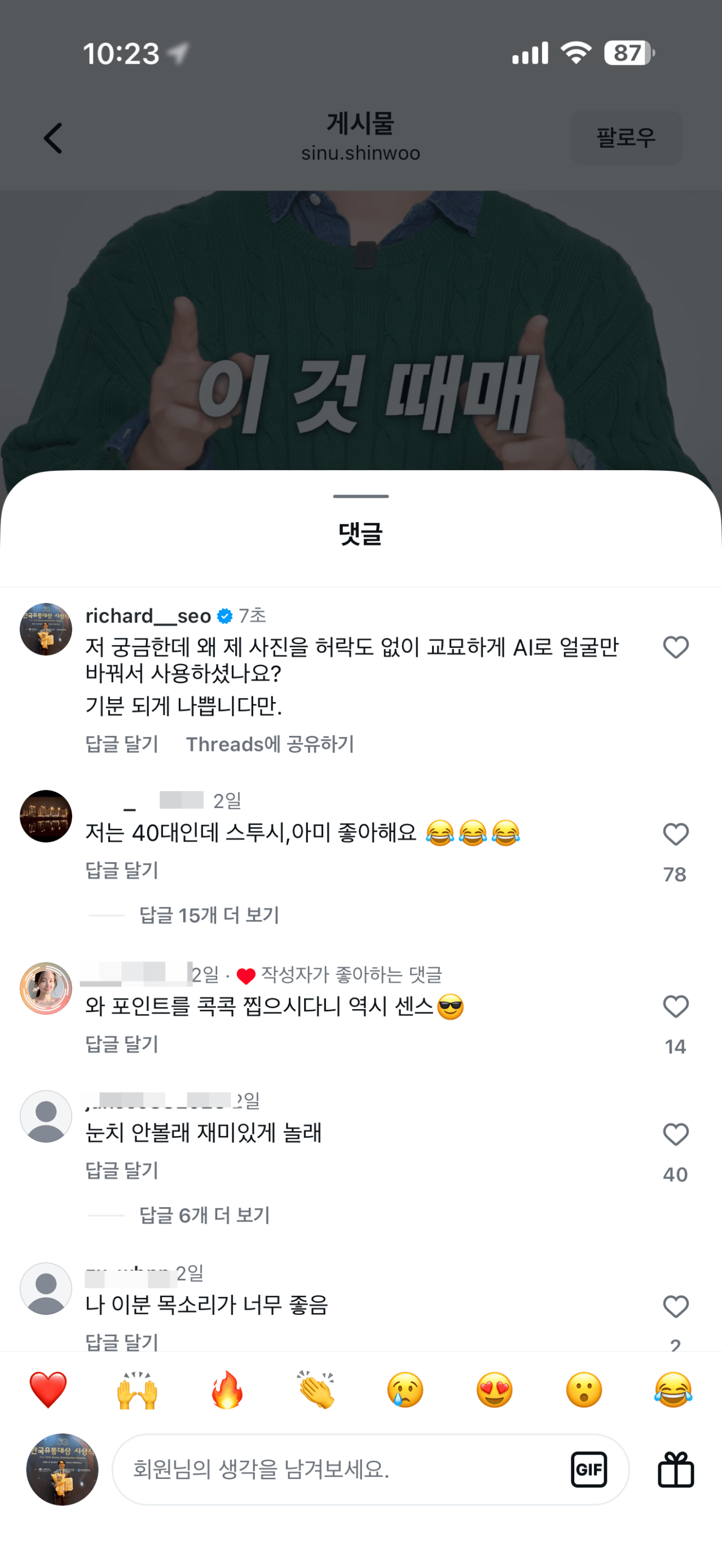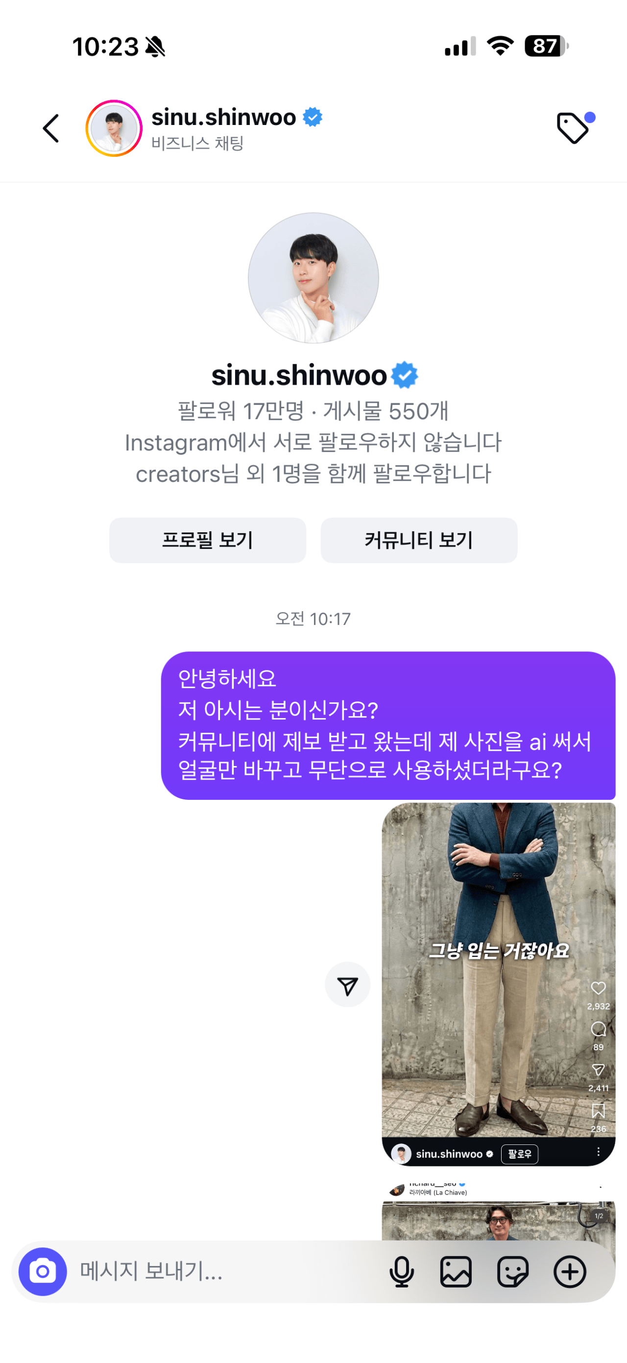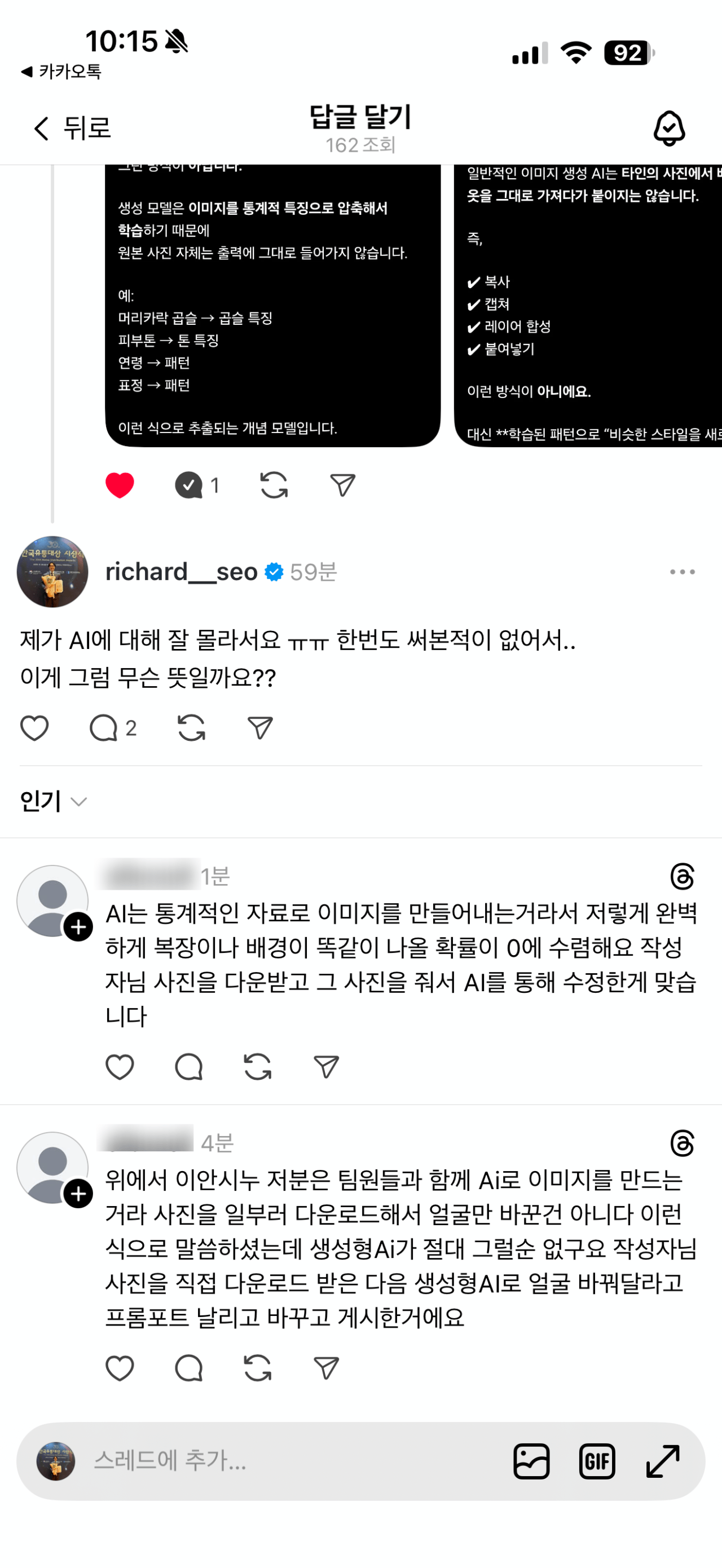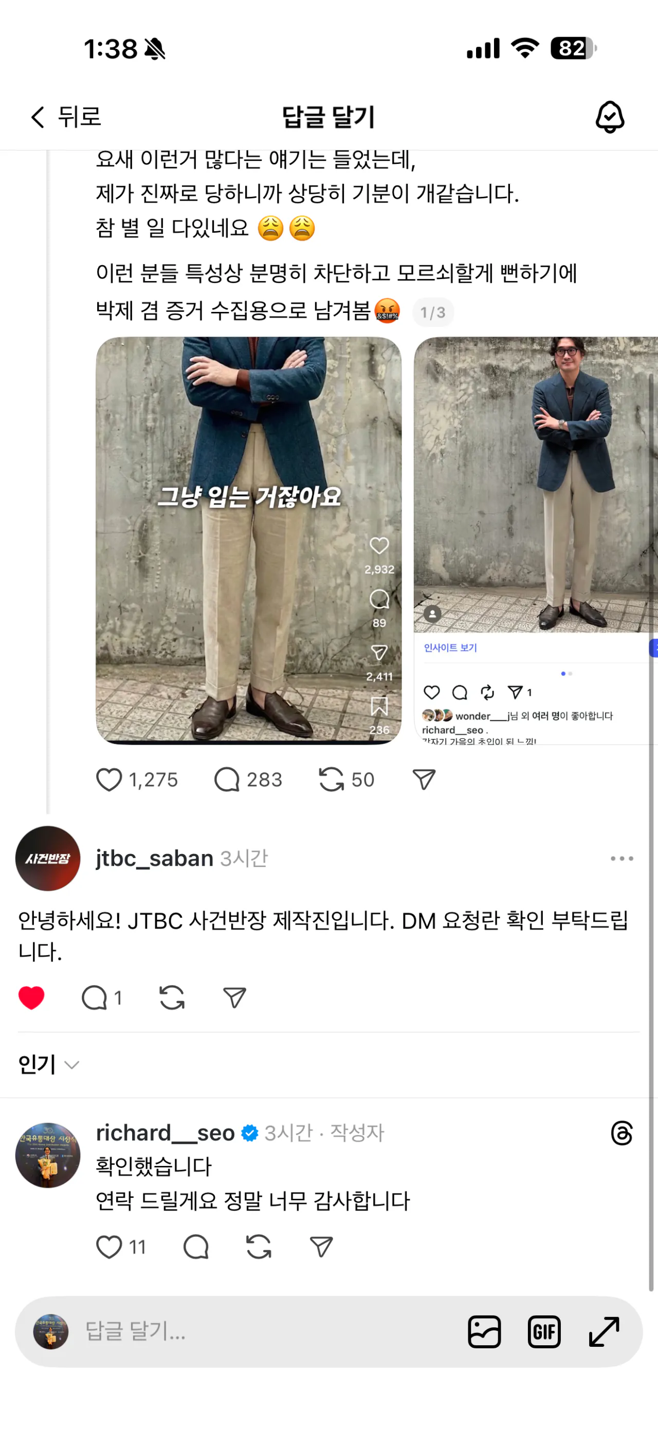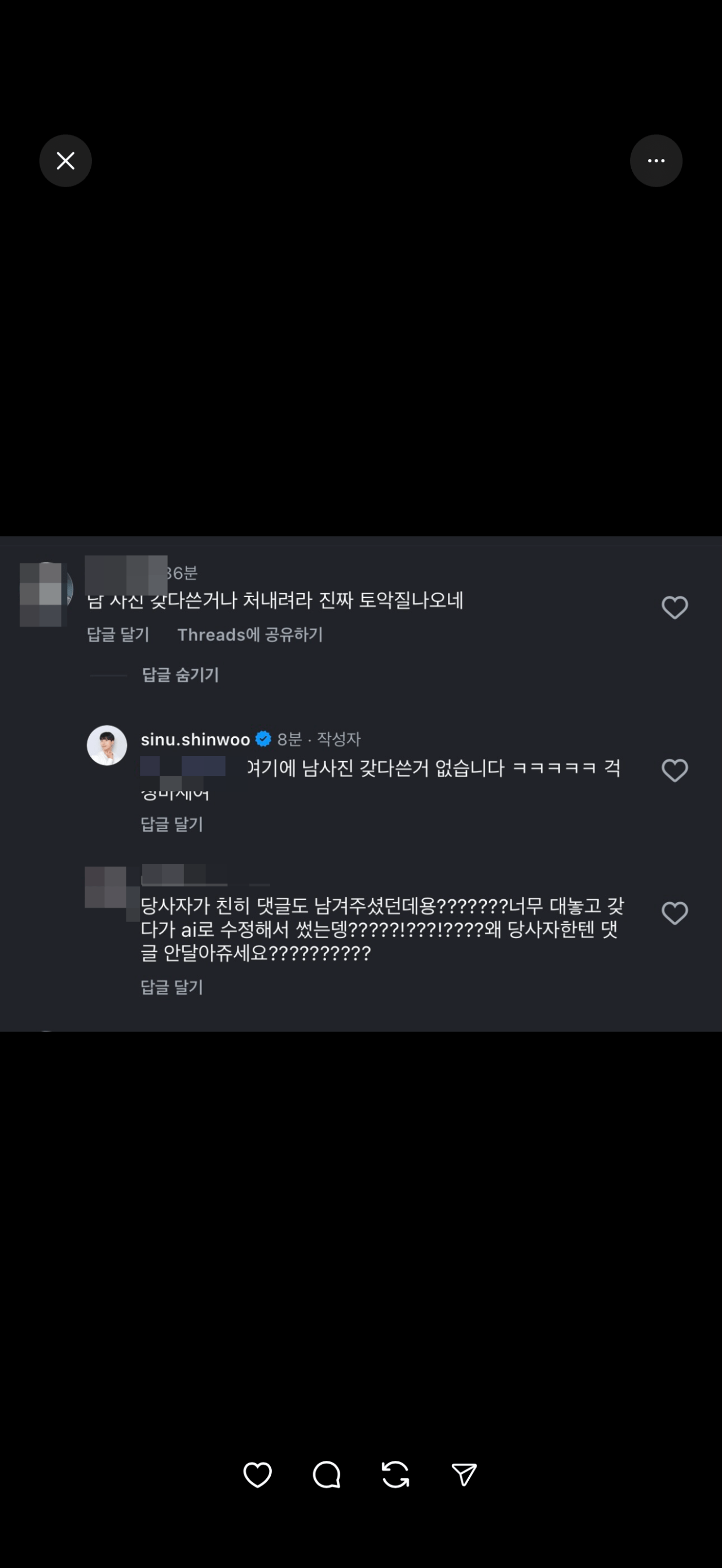 아무튼, 이후 시누님은 금요일 저녁까지 답하겠다는 말씀을 남겨주셨고, 제가 스레드 댓글에서 알게된 ”생성형 AI 이미지에 대한 거짓 해명 의혹“ 에 대한 답변은 전혀 주지 않으셨습니다. (스레드 답글은 물론 제 DM에도 답변을 하지 않으셨습니다)