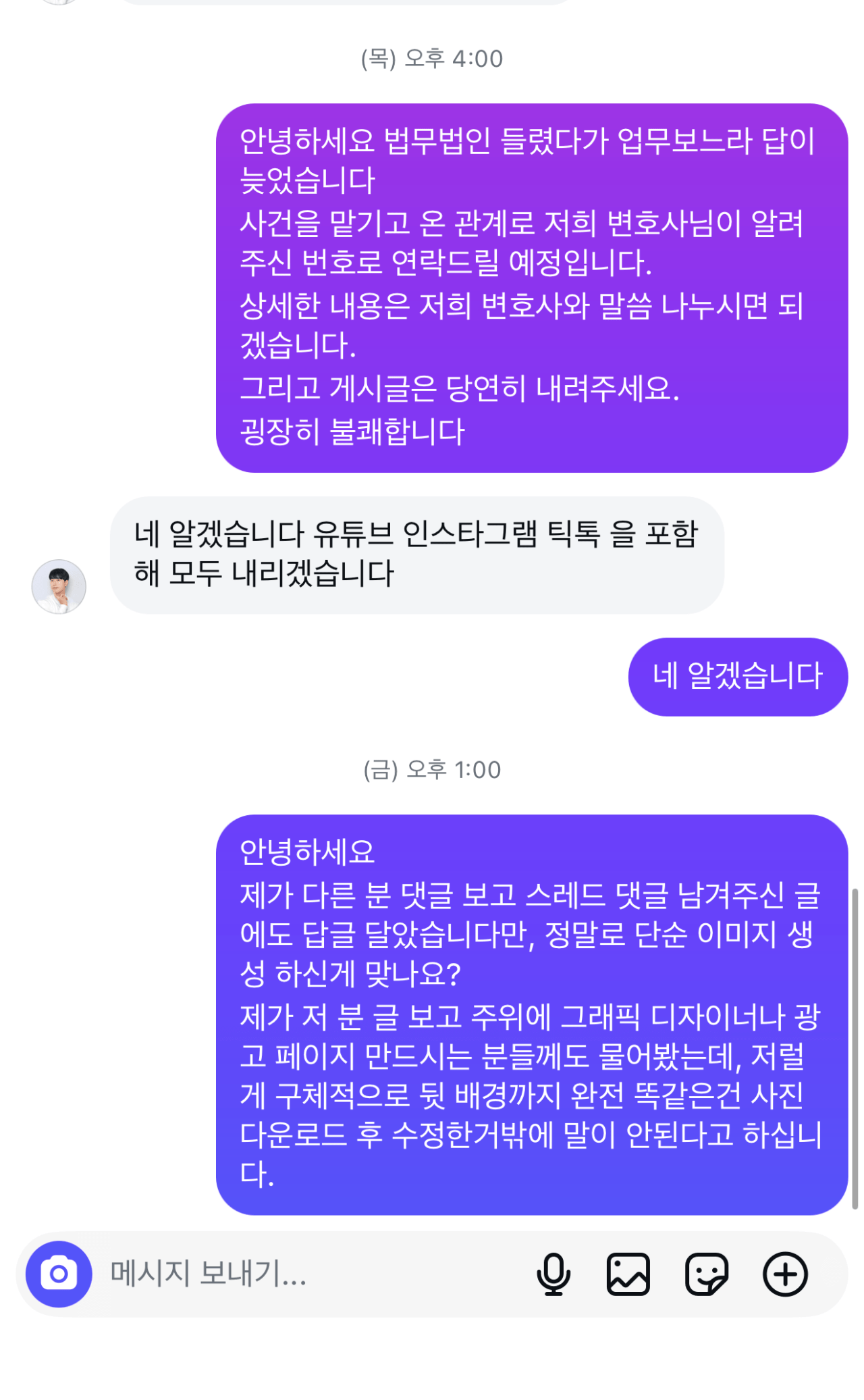 2. 처음에 사과하고 얘기가 잘 마무리 되는 듯 싶었으나 본인도 변호사 선임했다고