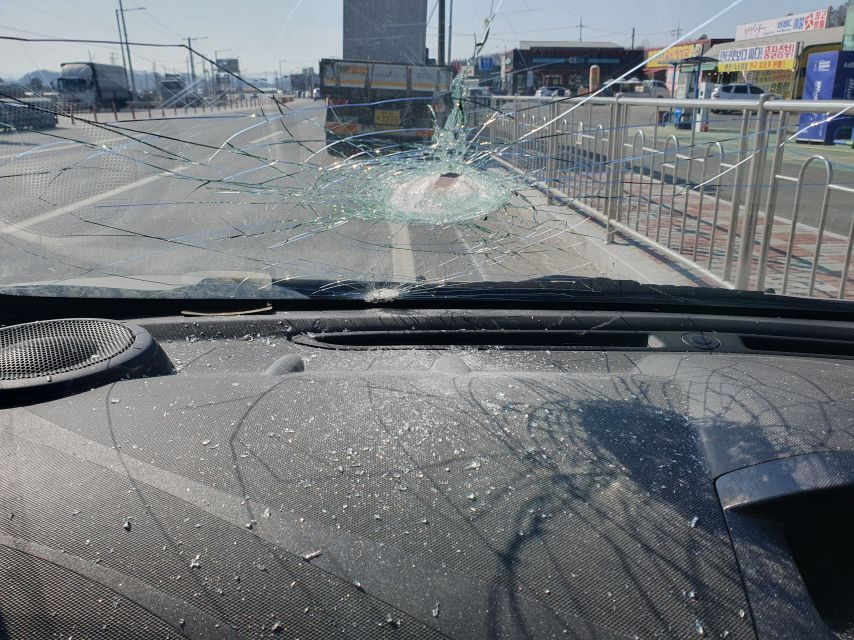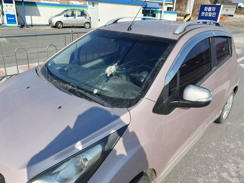 충주 집근처 거의 다와서 뭐가 퍽하더니 유리가 깨지길래 바로 길가에 차세우고 확인해보니,