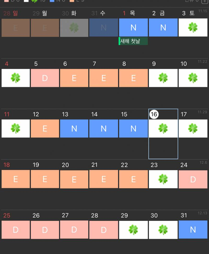 N 나이트근무 (밤근무) : 저녁9시 ~ 다음날 오전8시